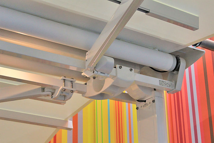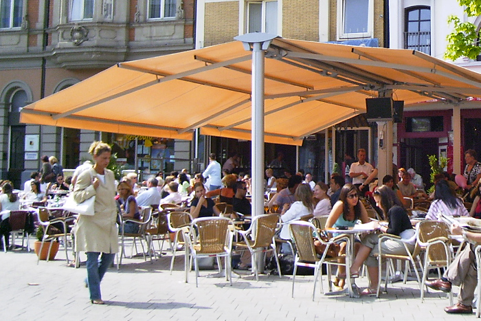 Herkömmliche Markisen schützen vor zu viel Sonne. Bei Regen sammeln sich in der ausgefahrenen Markise große Mengen Wasser, die schwere Schäden bis zur völligen Zerstörung anrichten. Dieses Problem löst die GASTRO SUNRAIN. Die stabile und intelligente Konstruktion ermöglicht es, dass die Markise selbst starkem Regen standhält. Ausgestattet mit einem wasserdichten Hochleistungsgewebe aus PVC bleibt die Fläche unter der Markise trocken. Der Wasserablauf wird bereits ab einer Neigung des Tuchs von 5 Grad garantiert. Alle belasteten Teile sind aus speziell gehärtetem Aluminium gefertigt. Die Garantie für hohe Sicherheit. Mit der GASTRO SUNRAIN machen Sie Ihre Außengastronomie weitgehend vom Wetter unabhängig.